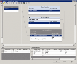 The job gerenates 1,000,000 rows and multiplies that by four in the transformer stage with a while loop construction. This creates four duplicate rows with minor differences. These rows are then dedupliced using the remove duplicates and aggegator stage. The result is written to /dev/null to minimize the impact of I/O.